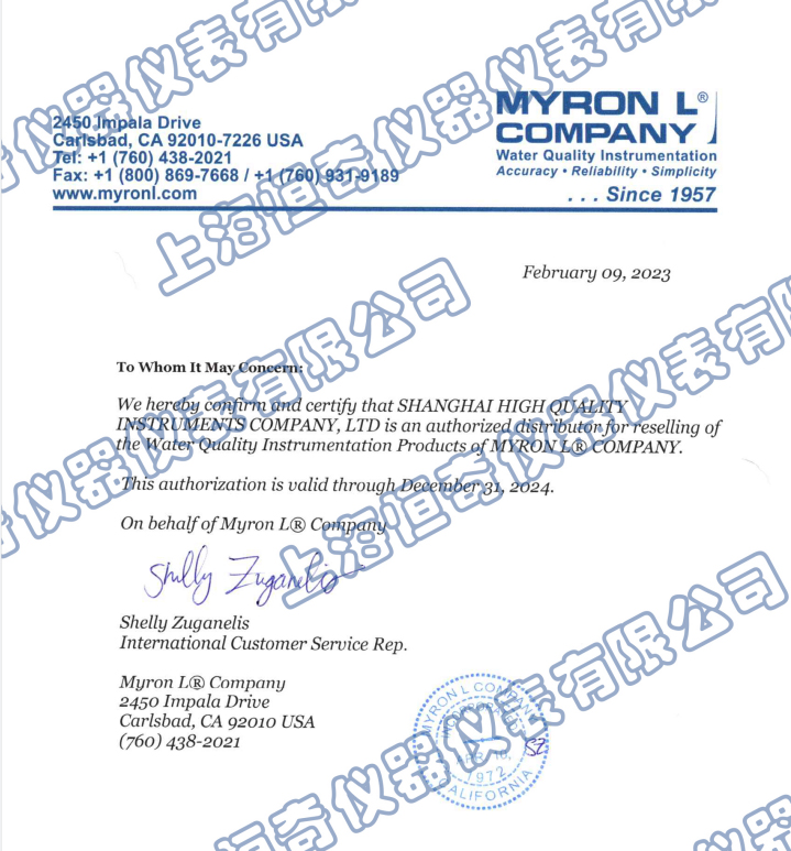 上海恒奇儀器儀表有限公司為美國麥隆公司(Myron L® )在中國大陸地區唯1授權經銷商。