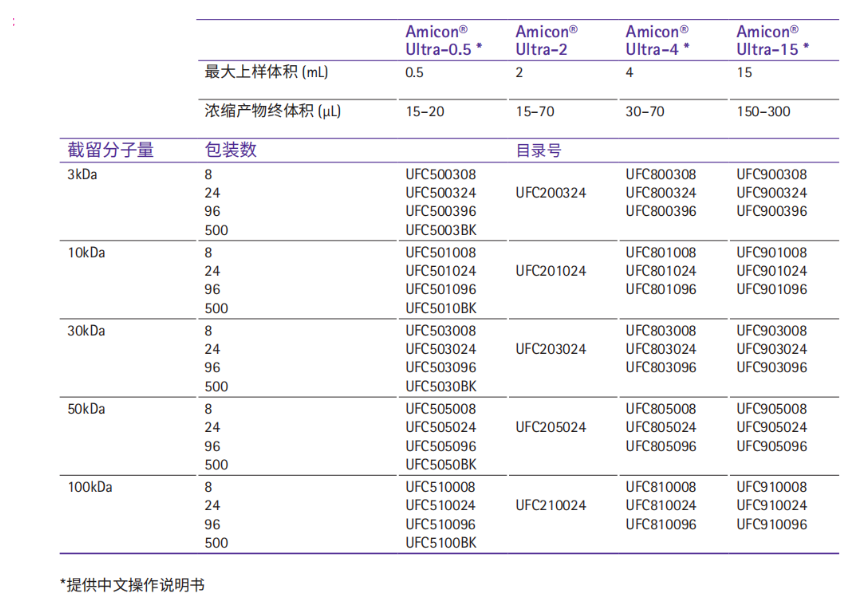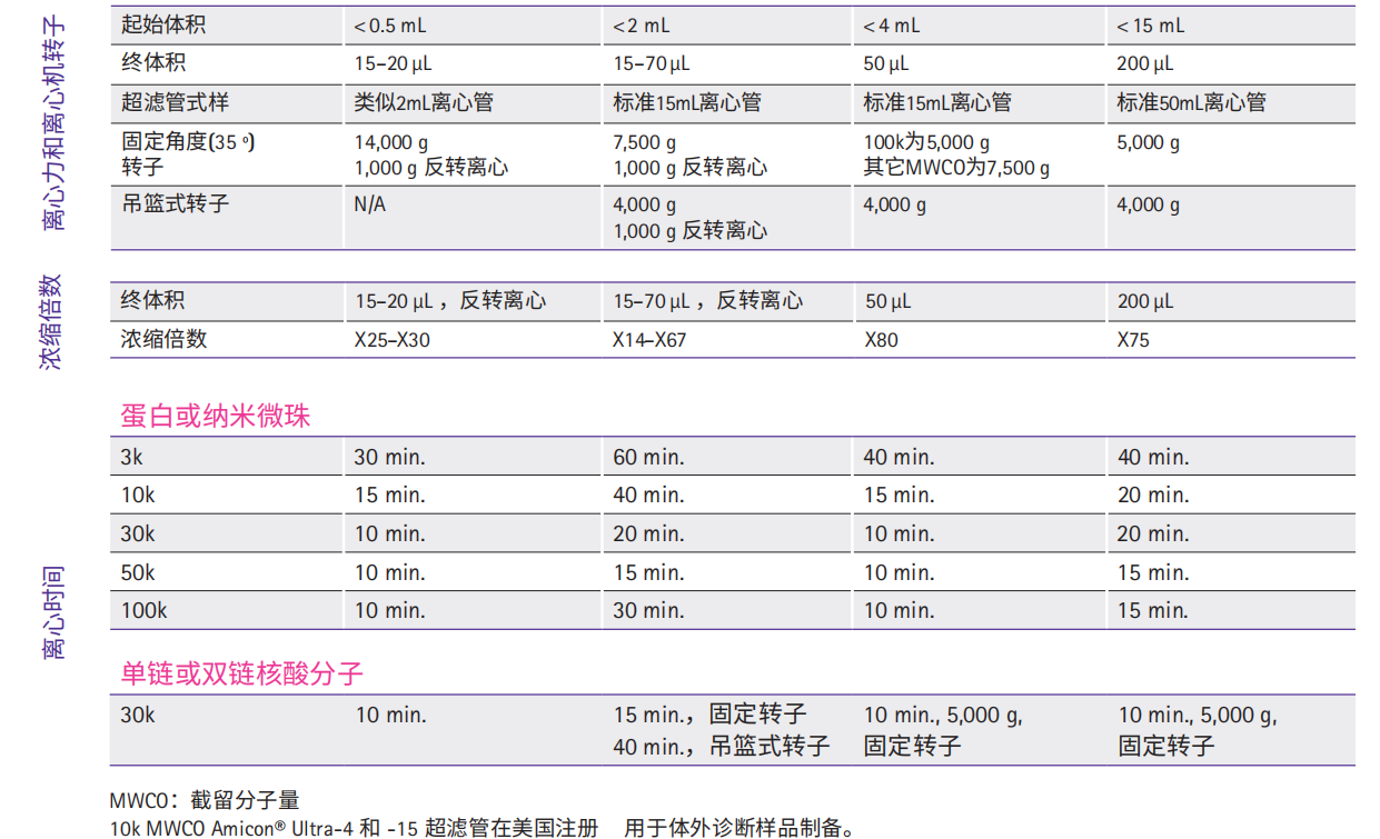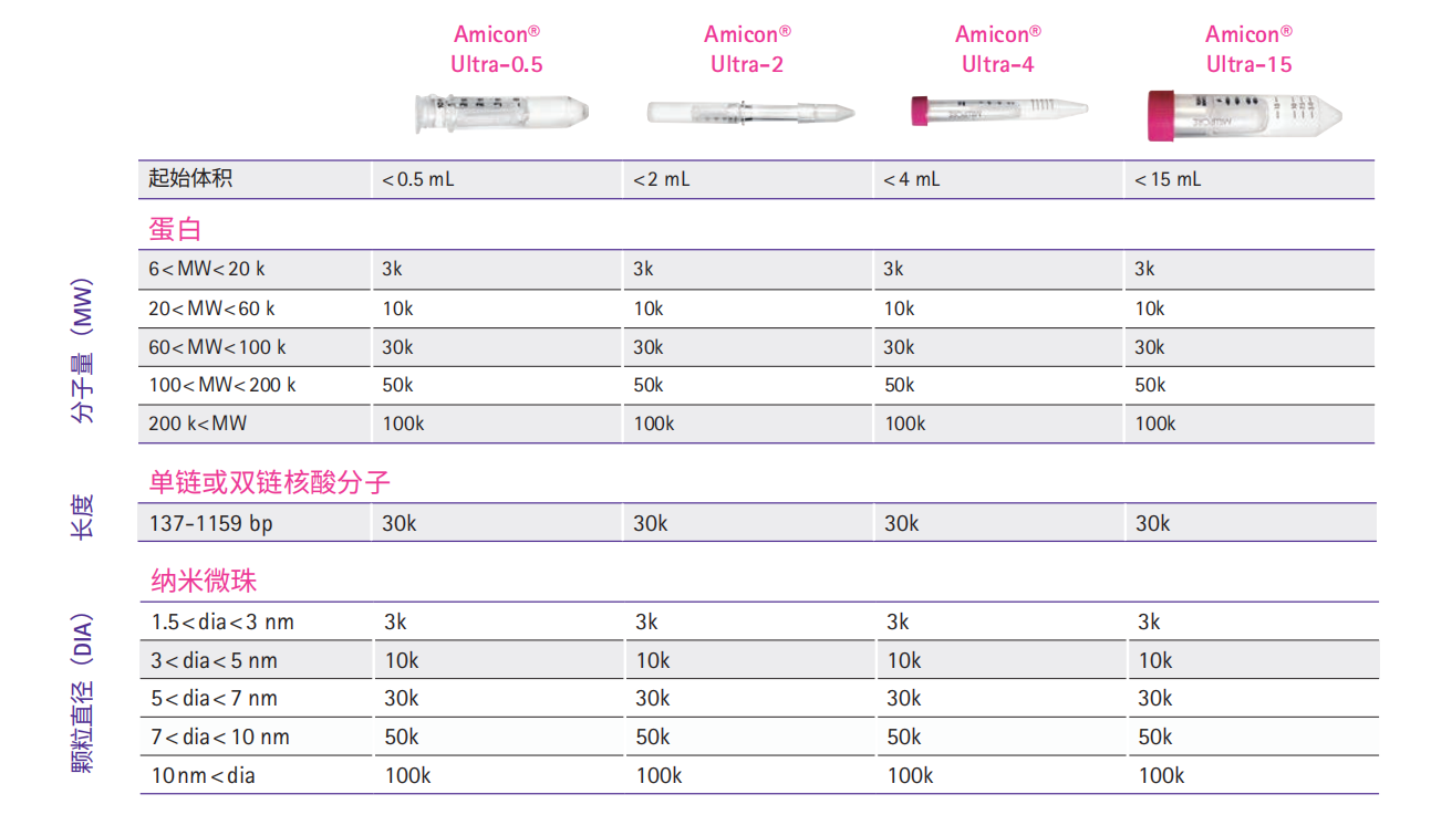 Amicon® Ultra系列超濾管產品需要根據起始樣品體積、目標蛋白或核酸的分子量、終體積及濃縮倍數等選擇具體型號。下表為選擇最適合截留分子量的超濾管提供了一些參考建議。