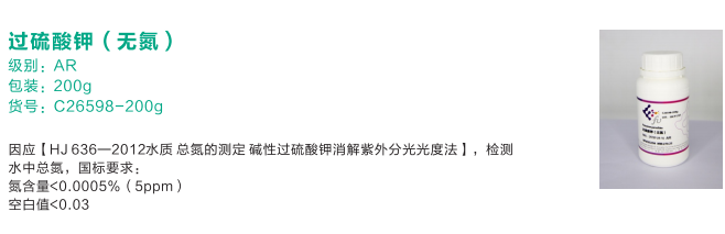 過硫酸鉀(無氮)C26598-200g應(yīng)用國標(biāo)簡介總氮是指水體中有機(jī)氮和無機(jī)氮含量的總和,總氮是控制水質(zhì)的一項(xiàng)重要指標(biāo)。因應(yīng)【HJ636—2012水質(zhì)總氮的測定堿性過硫酸鉀消解紫外分光光度法】,檢測水中總氮,國標(biāo)要求:氮…