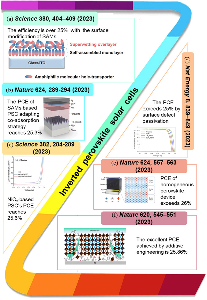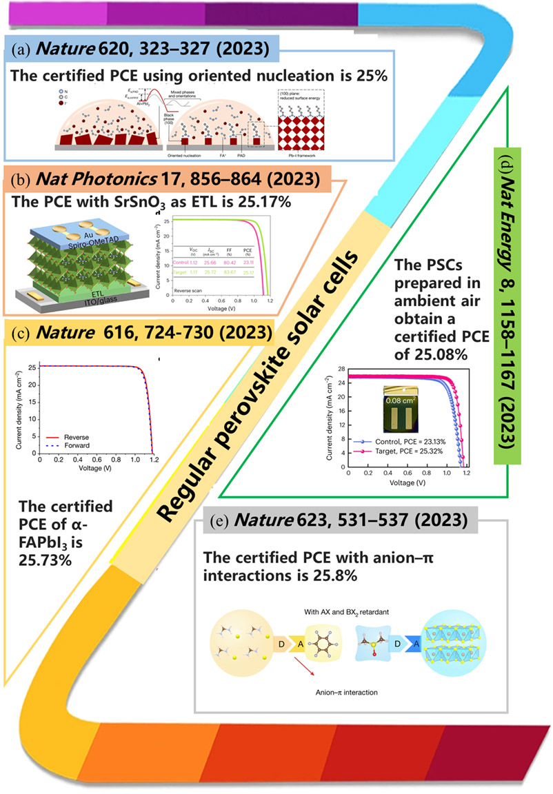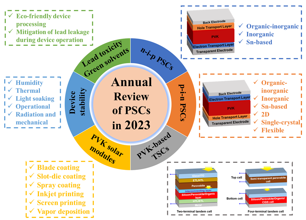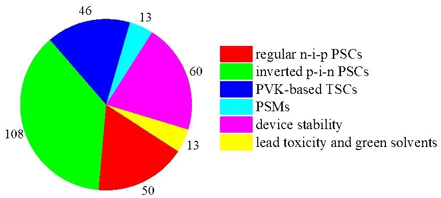 分類(lèi)詳細(xì)介紹了正式n-i-p PSC、反式p-i-n PSC、TSC、PSM、器件穩(wěn)定性、鉛毒性與綠色溶劑六大分類(lèi)在2023年的研究進(jìn)展(圖3)。