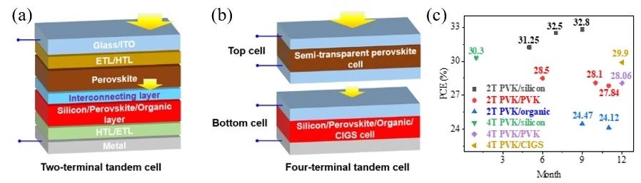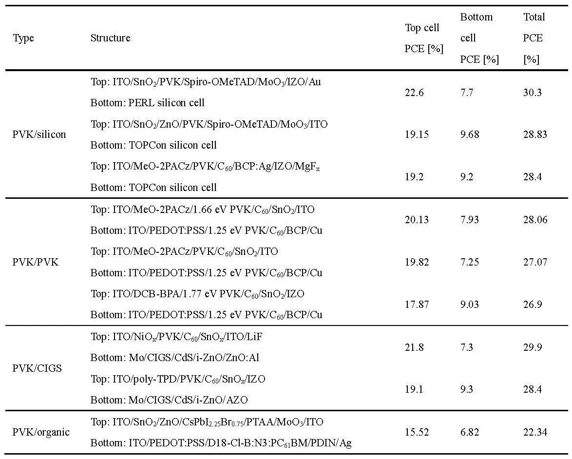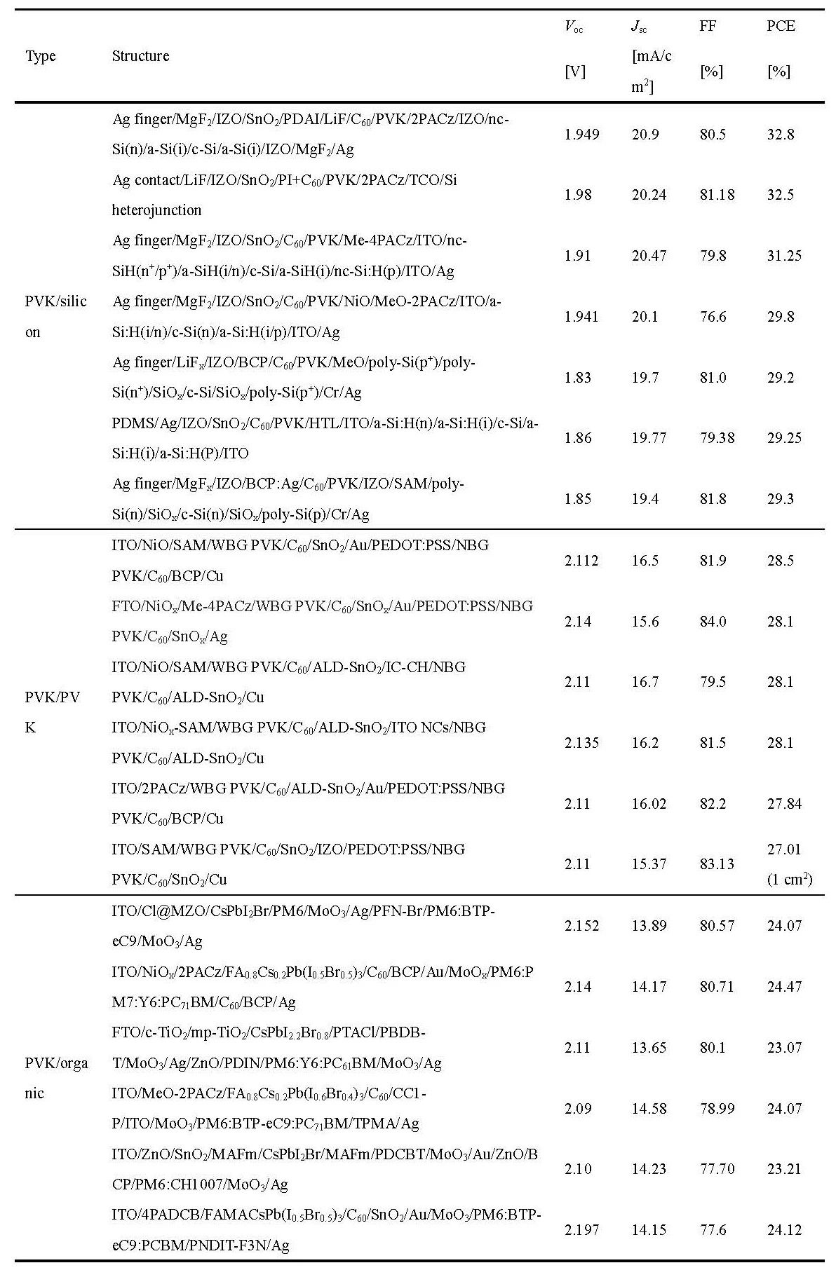 (3)TSC:目前,PVK基的TSC的PCE仍遠(yuǎn)低于理論極限。開(kāi)發(fā)低損耗互連層并提高子電池的性能將進(jìn)一步提高基于PVK基的TSC的PCE。