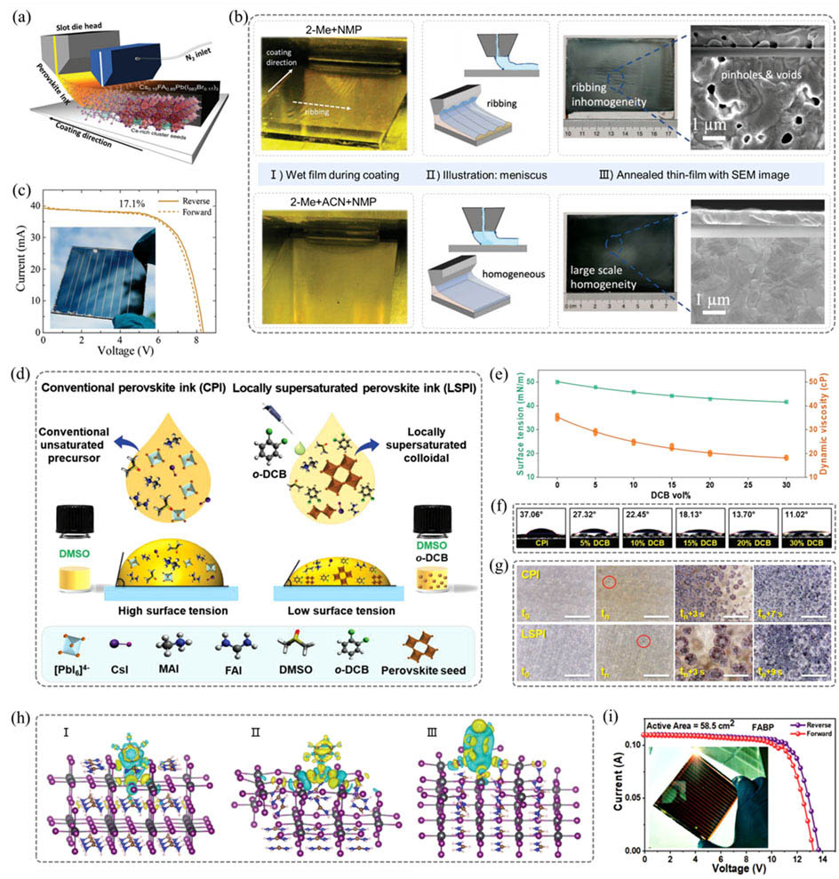 PSC的快速發(fā)展使其成為最有前景的新興光伏技術(shù)。在實(shí)驗(yàn)室規(guī)模的小面積PSC中,它們?cè)谛屎头(wěn)定性方面取得了顯著進(jìn)展。然而,PSC必須升級(jí)到模塊規(guī)模,才能成功地向商業(yè)化過(guò)渡。在過(guò)去的研究中,研究人員已經(jīng)提出了幾種可擴(kuò)展的制造方法來(lái)制造PSM。在這一節(jié),簡(jiǎn)要總結(jié)了PSM可擴(kuò)展制造在2023年的進(jìn)展,包含刮刀涂覆(圖7)、縫模涂布(圖8)、噴涂法(圖9(a-c))、噴墨打印法(圖9(d-f))、絲網(wǎng)印刷法(圖9(g-h))和氣相沉積(圖10)。
