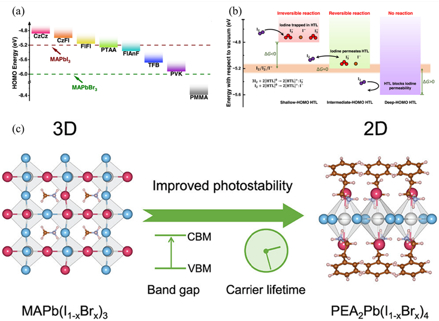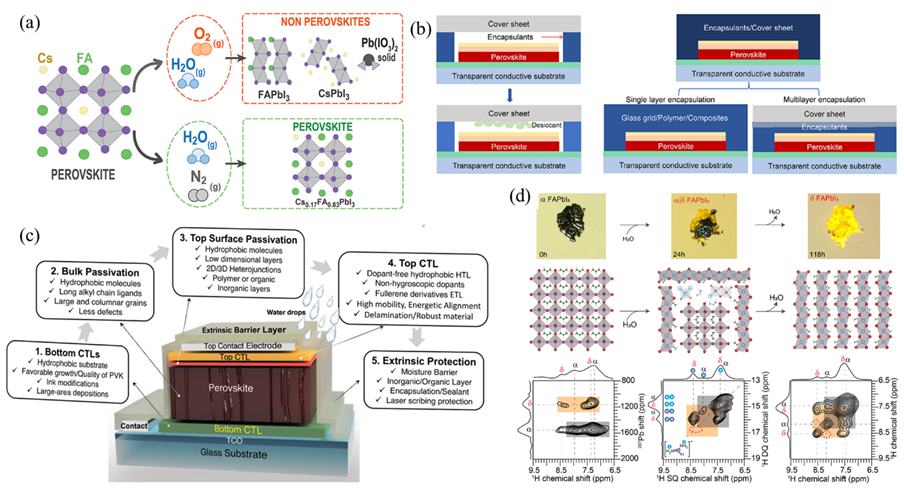(5)器件穩(wěn)定性:首先,應(yīng)設(shè)計(jì)本征穩(wěn)定的鈣鈦礦材料以滿(mǎn)足商業(yè)要求,例如在不失去最佳帶隙的情況下在FAPbI3中進(jìn)行陽(yáng)離子摻雜。其次,開(kāi)發(fā)可靠的封裝材料和技術(shù)對(duì)于保護(hù)PSC中敏感的鈣鈦礦和有機(jī)材料至關(guān)重要。第三,進(jìn)一步統(tǒng)一不同應(yīng)力條件下的穩(wěn)定性評(píng)估方法,如ISOS-S(暗儲(chǔ)存)、ISOS-L(光浸泡)、ISOS-O(室外)、ISOS-T(熱循環(huán))、ISOS-LT(光濕熱循環(huán)),特別是室外條件,對(duì)于加快其商業(yè)化進(jìn)程至關(guān)重要。
