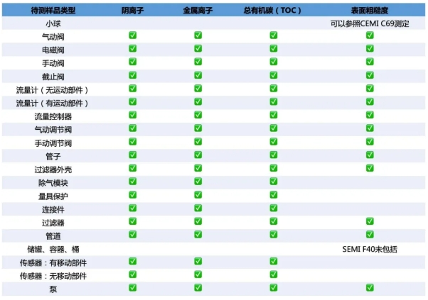 SEMI F57標準規定了需要的檢測項目有四類,分別為陰離子污染、金屬離子污染、總有機碳TOC和表面粗糙度。