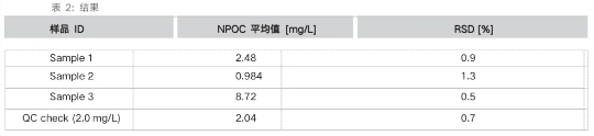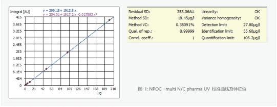 使用multi N/C pharma系列分析儀, 采用NPOC法,曲線范圍0.1 ~ 20 mg/L,采用多點定標的方式,標準溶液用1000 mg/L蔗糖儲備液配制。校準曲線及其特征值如圖1所示。